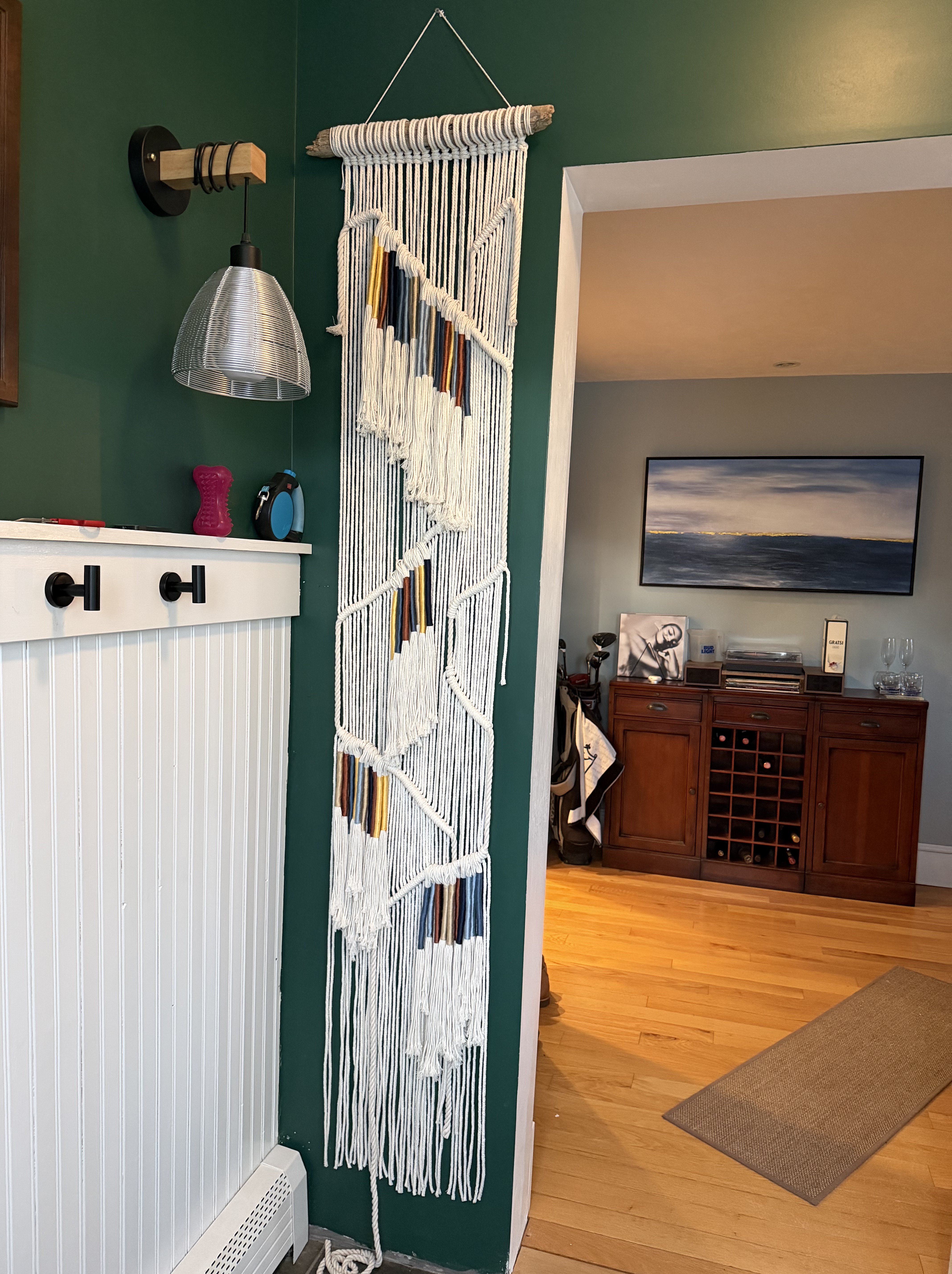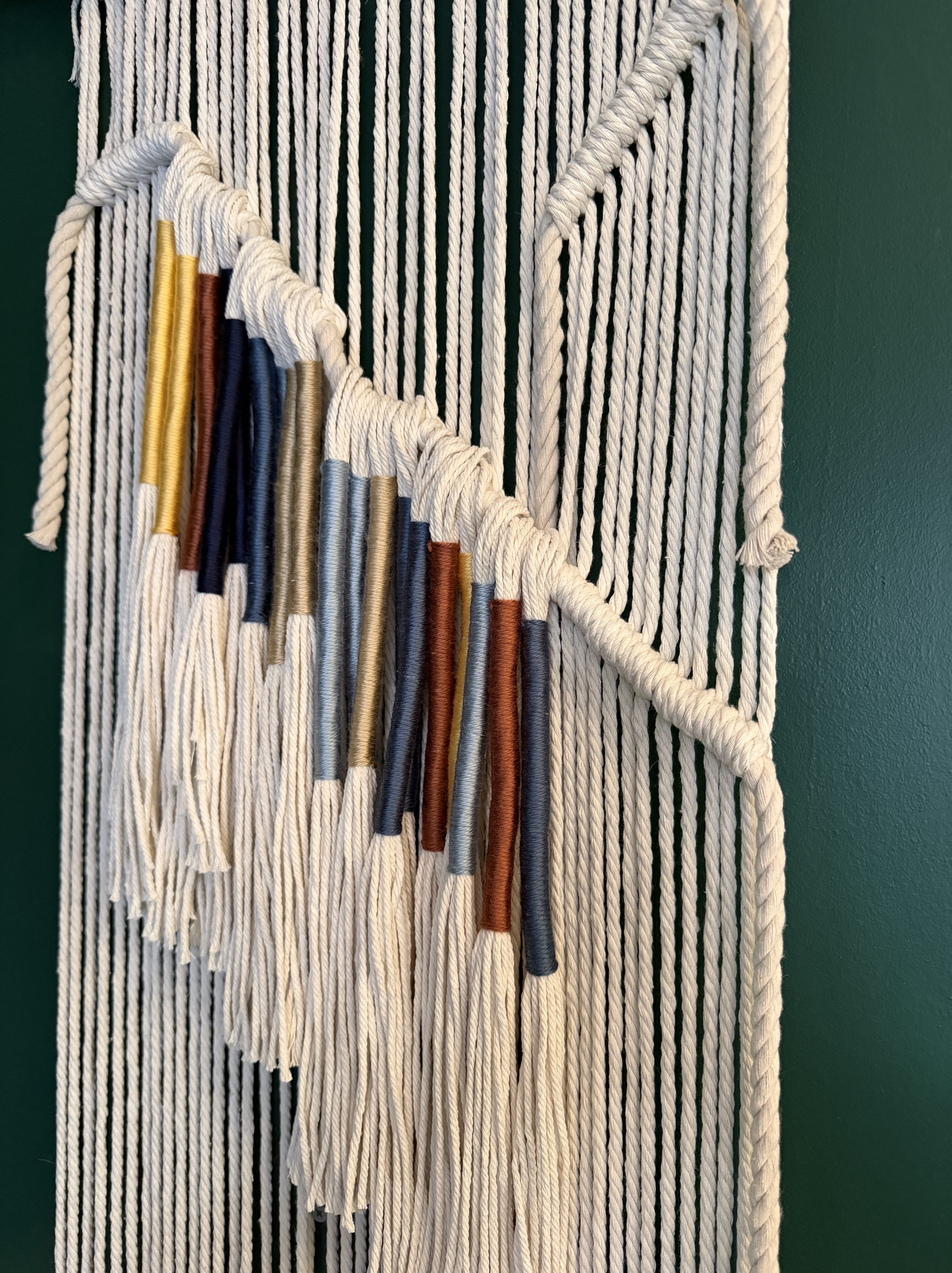 This statement mixed media piece is crafted with natural cord, acrylic yarn, and rope and features flowing vertical cords intersected with bold knot work. Sections of richly colored fibers — shades of blue, warm rust, muted gold, and sand — are woven throughout, creating bands of texture that echo shoreline striations. Suspended from a piece of Nantasket Beach driftwood, the elongated design draws the eye downward with organic movement, adding a striking presence to any space.