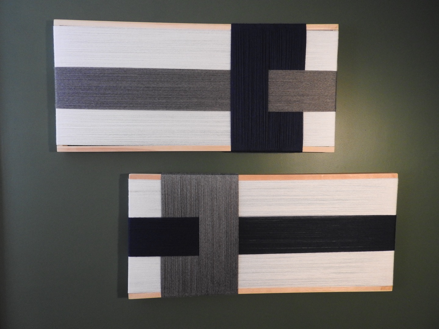 Bring a relaxed, coastal feel into your space with this set of handwoven wall-hangings. They feature soft layers of white, driftwood gray, and deep navy — echoing sea, sand, and sky. The clean design adds a modern boho touch, while the eye-catching angles and soft pine frame bring texture to any room.